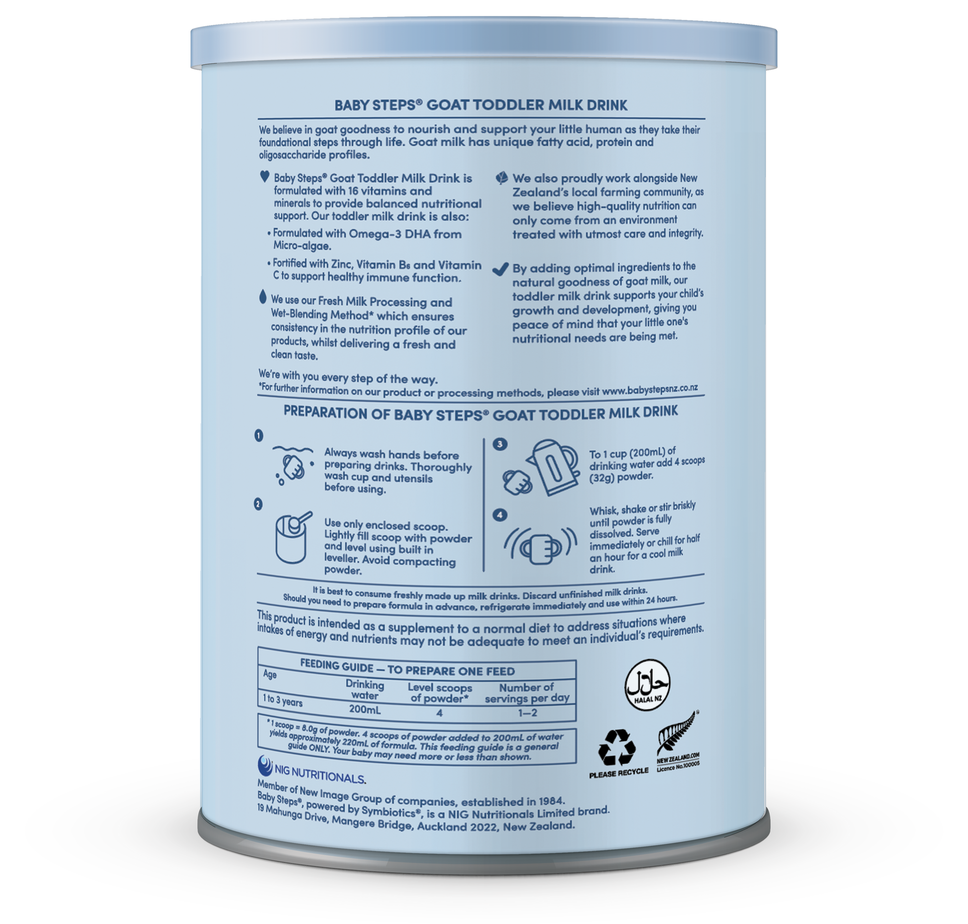 Baby Steps Goat Toddler Milk Drink is a formulated supplementary food for young children. It is intended as a supplement to a normal diet to address situations where intakes of energy and nutrients may not be adequate to meet an individual’s requirements.