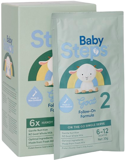 Baby Steps Goat Follow-On Formula is lovingly made in New Zealand and designed to provide balanced nutritional support for babies aged 6-12 months old.