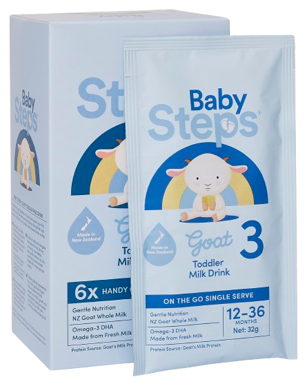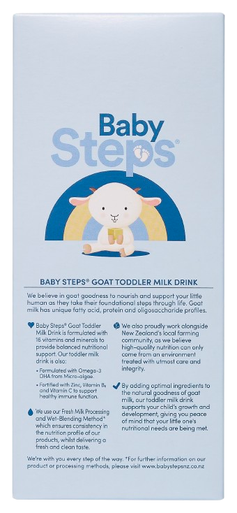 Baby Steps Goat Toddler Milk Drink is lovingly made in New Zealand and designed to provide balanced nutritional support for babies aged 12 – 36 months old. Â