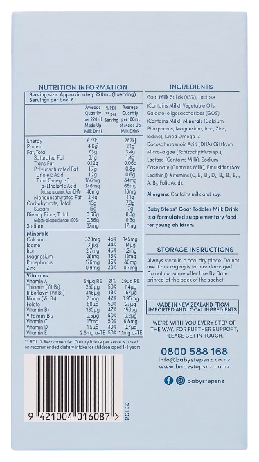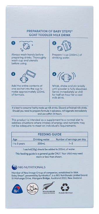 Baby Steps Goat Toddler Milk Drink is a formulated supplementary food for young children. It is intended as a supplement to a normal diet to address situations where intakes of energy and nutrients may not be adequate to meet an individual’s requirements.